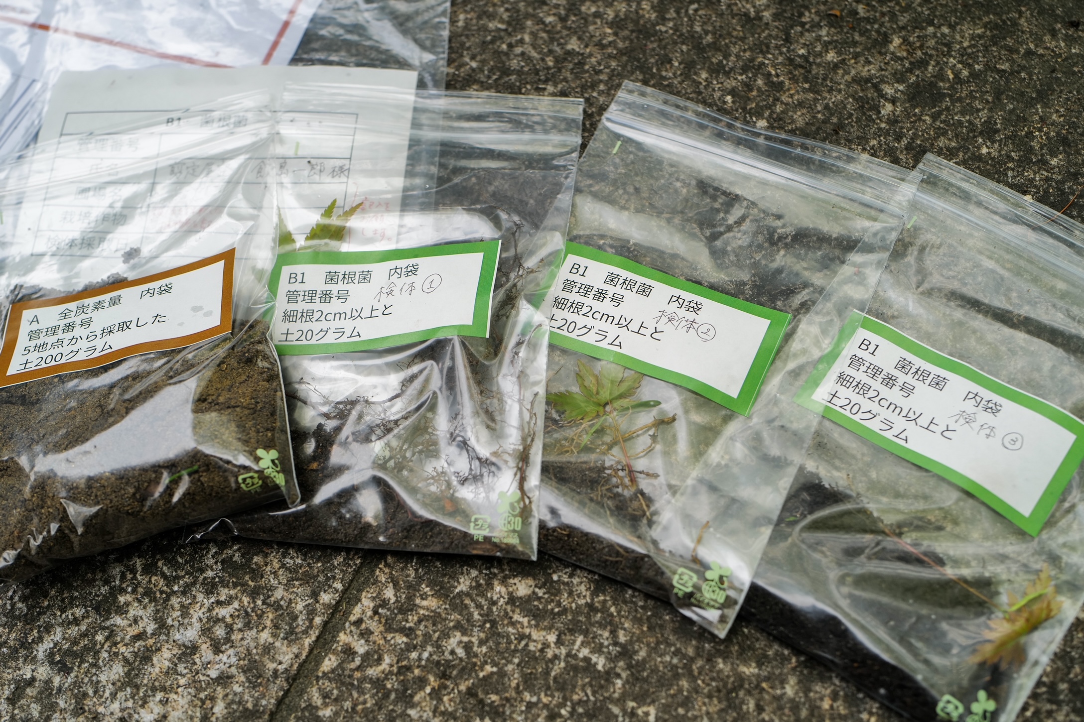 モミジの実生3本の細根と周辺土壌を菌根菌分析(AM菌共生率・胞子数)のために採取し、全炭素の分析用に5地点、土壌分析用(化学性・物理性)にも5地点、それぞれ採取しました。